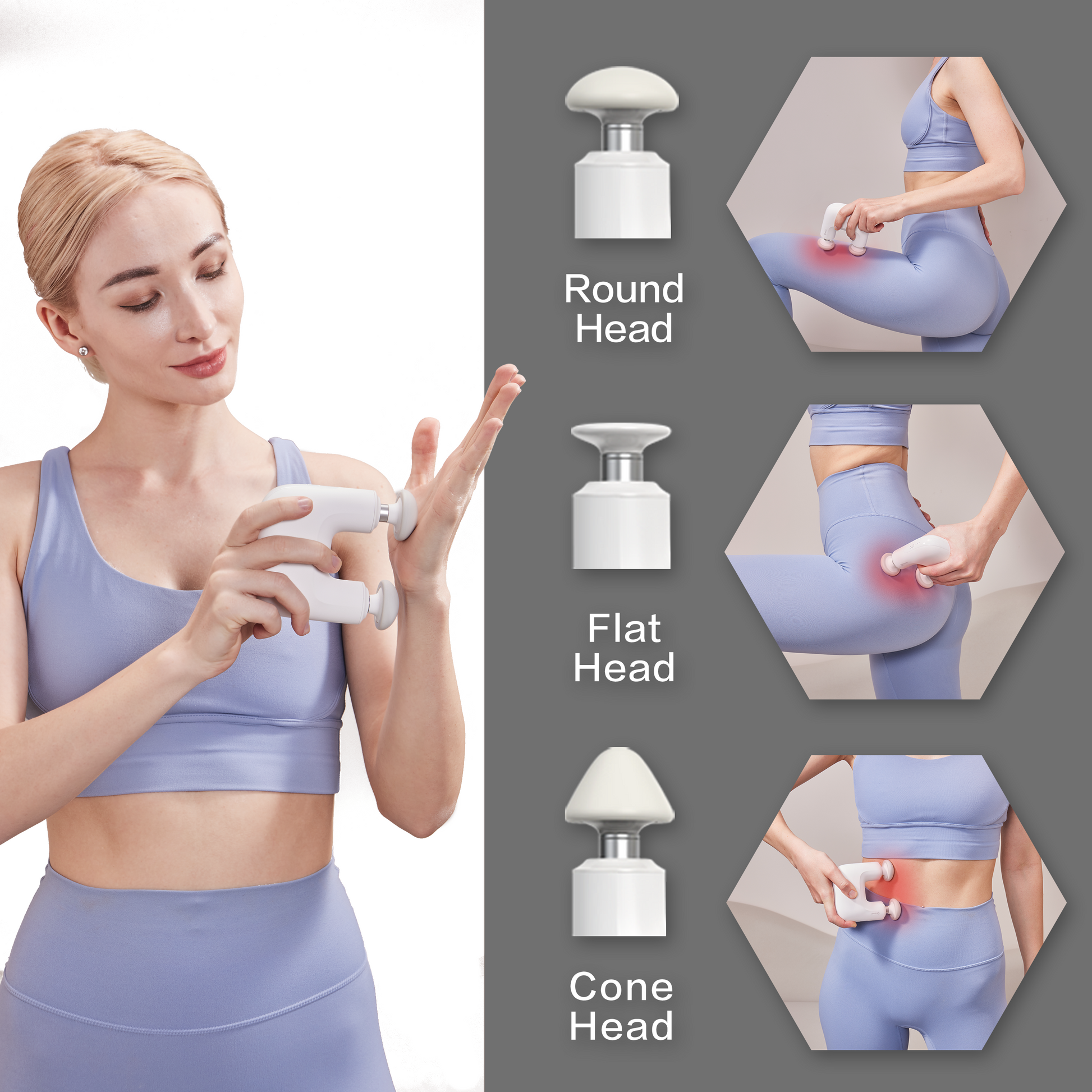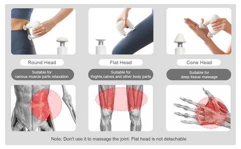 【Small Massage Gun but Powerful】 Performance stability 3 kinds massage heads, the round head (detachable) is suitable for relaxation and shaping of various muscles parts, the cone head (detachable)is good for soothing sore muscles,the flat one(not detachable ) is suitable for calves, thighs and other sensitive muscle groups.